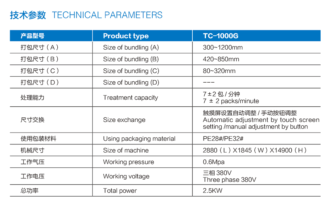TC-1000G型通過式捆綁機為皮帶順向輸送紙垛到位檢測停止后完成捆綁。根據(jù)設(shè)定可實現(xiàn)一個紙箱捆綁一道、兩道、三道等,每道繩可捆扎單圈,雙圈等功能。此機型接頭特點適應(yīng)捆綁細長的物體(理論長度無限制)