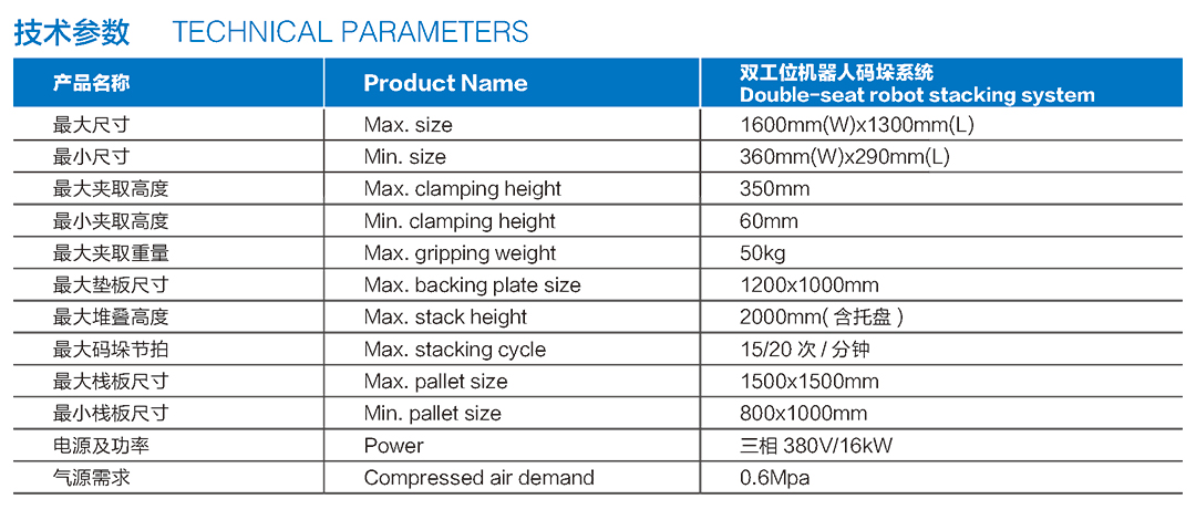 雙工位機器人碼垛系統(tǒng)由碼垛機器人,收紙物流,(掉向物流選配)居中排齊物流,輸送物流,拉距物流,整理抬起部,夾墊紙部,機械碼垛部,護欄及道閘部組成。